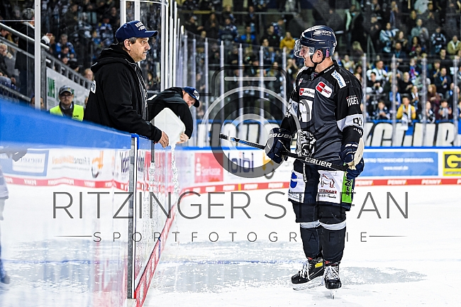 Marcel Brandt (Nr.92 - Straubing Tigers) im Austausch mit einem Betreuer