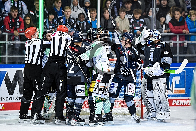 Unstimmigkeiten vor dem Tor von Torwart Sebastian Vogl (Nr.25 - Straubing Tigers)