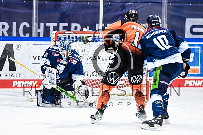 Torwart Tomi Karhunen (Nr.33 - Straubing Tigers) hält gegen Trevor Mingoia (Nr.11 - Grizzlys Wolfsburg)