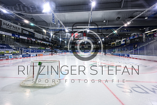 Blick ins leere Stadion beim Geisterspiel. Die Banner hängen die Zuschauer sind weg