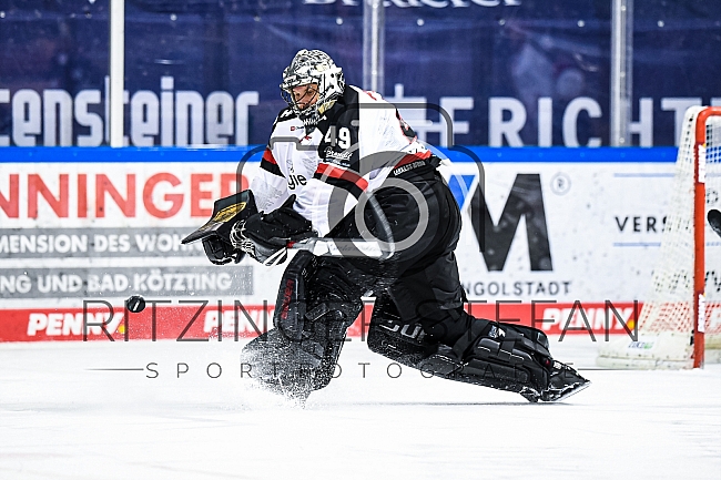 Torwart Justin Pogge (Nr.49 - Koelner Haie) spielt den Puck