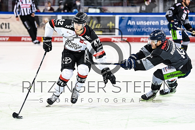 Luis Üffing (Nr.42 - Kölner Haie) im Zweikampf mit Tim Brunnhuber (Nr.19 - Straubing Tigers)