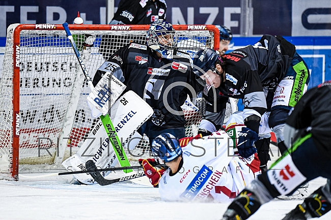 Jakob Mayenschein (Nr.41 - Duesseldorfer EG) rutscht an Torwart Sebastian Vogl (Nr.25 - Straubing Tigers) vorbei