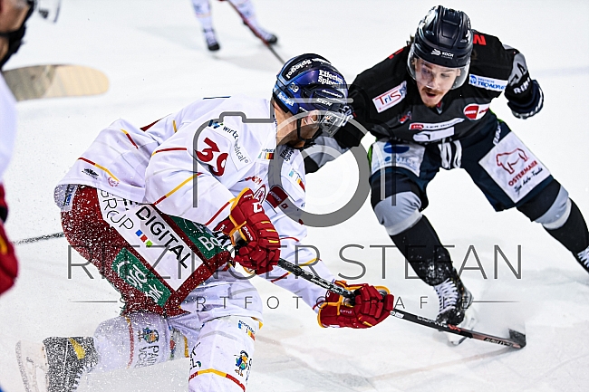 Victor Svensson (Nr.39 - Duesseldorfer EG) im Zweikampf mit Travis St. Denis (Nr.74 - Straubing Tigers)