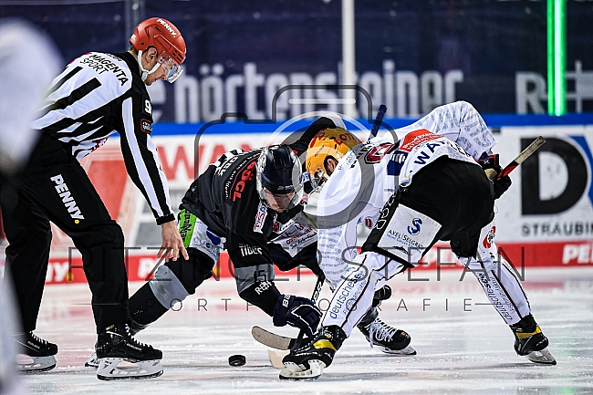 T.J. Mulock (Nr.15 - Straubing Tigers) beim Bully gegen Nino Kinder (Nr.8 - Fischtown Pinguins)