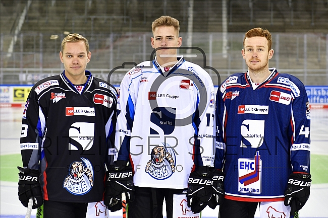 Beschreibung: Im Bild Tim Brunnhuber (Nr.19 - Straubing Tigers), Adrian Klein (Nr.17 - Straubing Tigers), Marco Baßler (Nr.44 - Straubing Tigers) mit den neuen Trikots.