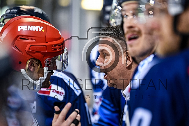 Chef-Trainer Tom Pokel (Straubing Tigers) im Gespräch mit Schiedsrichter Andrew Bruggeman (DEL)