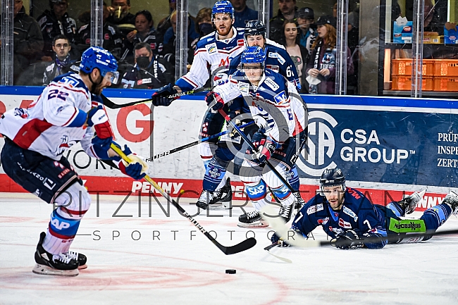 Taylor Leier (7-Straubing Tigers) versucht den Puck noch vor Matthias Plachta (22-Adler Mannheim) zu erreichen