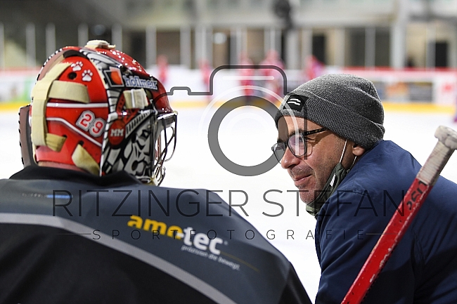 Beschreibung: Im Bild Torwart Jochen Vollmer (Nr.29-ECDC Memmingen Indians), Thomas Greiling (Nr.39-Deggendorfer SC).
