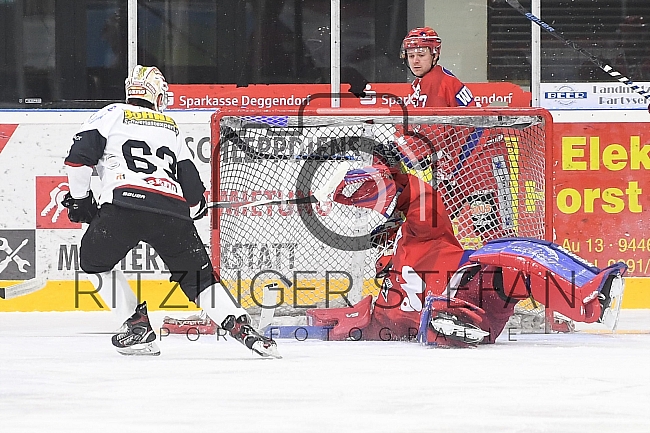 Beschreibung: Im Bild Mark Ledling (Nr.63-ECDC Memmingen Indians), Torwart Raphael Fössinger (Nr.92-Deggendorfer SC).