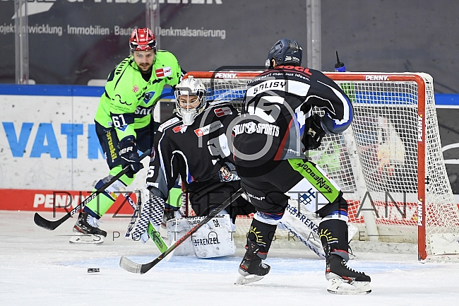 Torwart Sebastian Vogl (Nr.25 - Straubing Tigers) und Chase Balisy (Nr.16 - Straubing Tigers) klären vor David Elsner (Nr.61 - ERC Ingolstadt)