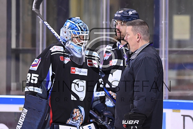 Beschreibung: Im Bild Torwart Marco Eisenhut (Nr.35 - Straubing Tigers), Chef-Trainer Tom Pokel (Straubing Tigers).