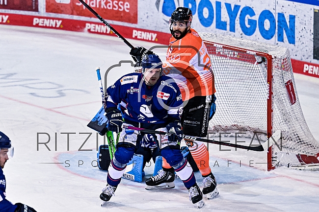 Marcel Brandt (92-Straubing Tigers), Darren Archibald (25-Grizzlys Wolfsburg) und Torwart Hunter Miska (35-Straubing Tigers)