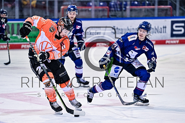 Tyler Morley (86-Grizzlys Wolfsburg) vor Mario Zimmermann (13-Straubing Tigers)