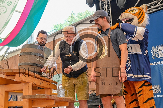 Festwirt Stephan Weckmann erklärt Cole Fonstad (42-Straubing Tigers) kurz das Prozedere beim Anzapfen