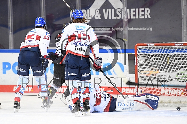 Stefan Loibl (Nr.13 - Adler Mannheim), Markus Eisenschmid (Nr.16 - Adler Mannheim) und Torwart Felix Brückmann (Nr.90 - Adler Mannheim) mur Zuschauer beim 1:1 von Chase Balisy (Nr.16 - Straubing Tigers) bei Unterzahl Straubing