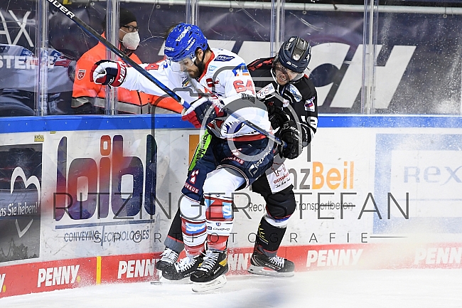 Jeremy Williams (Nr.18 - Straubing Tigers) im Zweikampf mit Craig Schira (Nr.64 - Adler Mannheim)