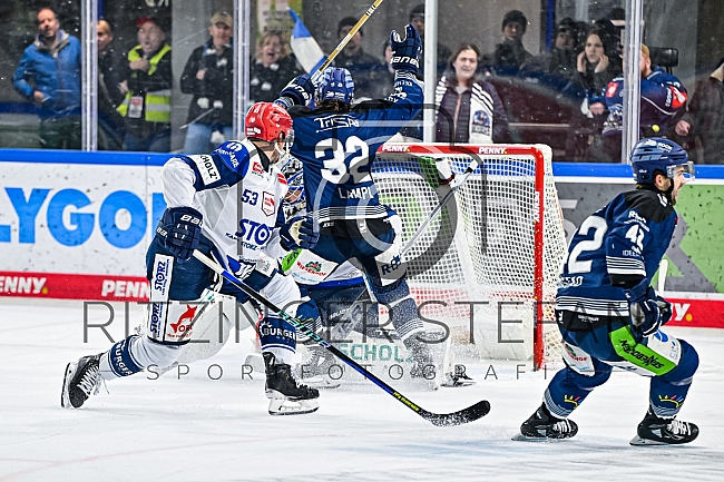 Cody Lampl (32-Straubing Tigers) bejubelt das Tor zum 3-0 von Cole Fonstad (42-Straubing Tigers)