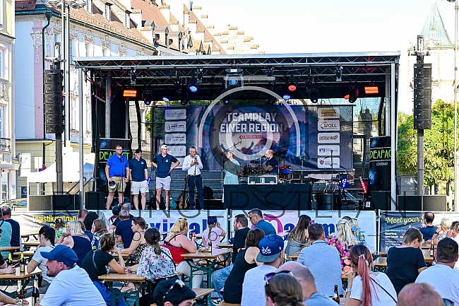 Beschreibung: Fanbeauftragter Florian Mittermeier, #1 Goalkeeper Florian Bugl (Straubing Tigers), #8 Joshua Samanski (Straubing Tigers), Oberbürgermeistzer Markus Pannermayr, CEO Gaby Sennebogen (Straubing Tigers) und Moderator Tobias Welck auf der Stadtbühne