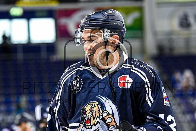 gut gelaunter Corey Tropp (Nr.12 - Straubing Tigers) beim Warmup