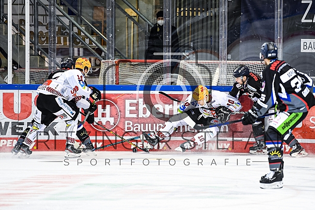 Cory Quirk (Nr.11 - Fischtown Pinguins), Andreas Eder (Nr.20 - Straubing Tigers), Filip Reisnecker (Nr.10 - Fischtown Pinguins) und Marco Bassler (Nr.44 - Straubing Tigers) im Zweikampf an der Bande