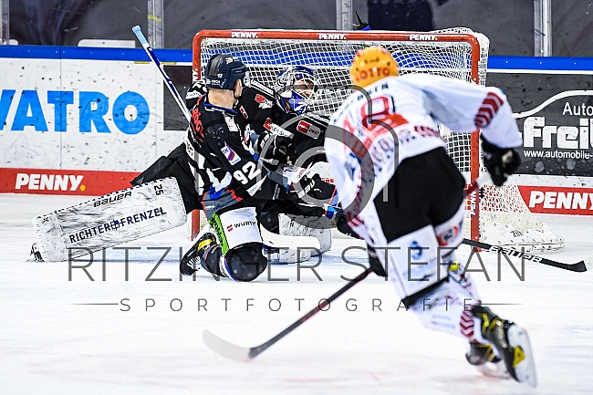 der Schlagschuß von Niklas Andersen (Nr.48 - Fischtown Pinguins) schlägt rechts oben ein zum 1:1, Marcel Brandt (Nr.92 - Straubing Tigers) und Torwart Sebastian Vogl (Nr.25 - Straubing Tigers) haben das nachsehen