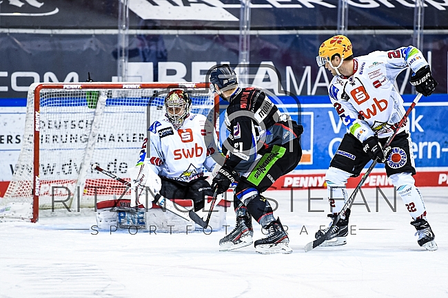 Torwart Tomas Pöpperle (Nr.42 - Fischtown Pinguins), Kael Mouillierat (Nr.21 - Straubing Tigers) und Vladimir Eminger (Nr.22 - Fischtown Pinguins)