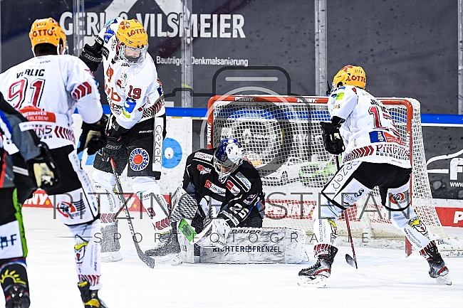 Torwart Sebastian Vogl (Nr.25 - Straubing Tigers) vor Christian Hilbrich (Nr.19 - Fischtown Pinguins) und Ziga Jeglic (Nr.13 - Fischtown Pinguins)