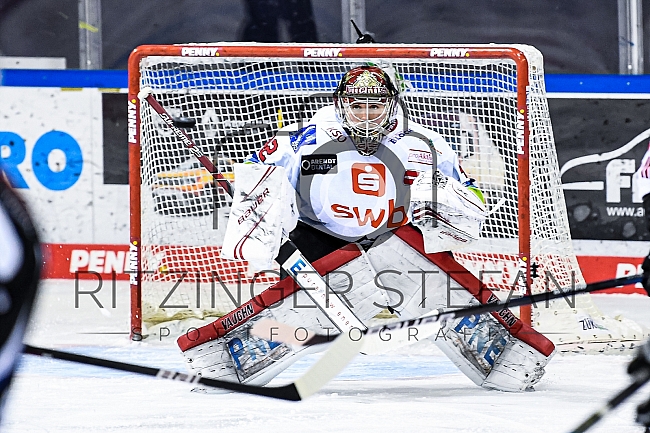 Torwart Tomas Pöpperle (Nr.42 - Fischtown Pinguins) fokusiert auf den Schuß von, Sena Acolatse (Nr.62 - Straubing Tigers)
