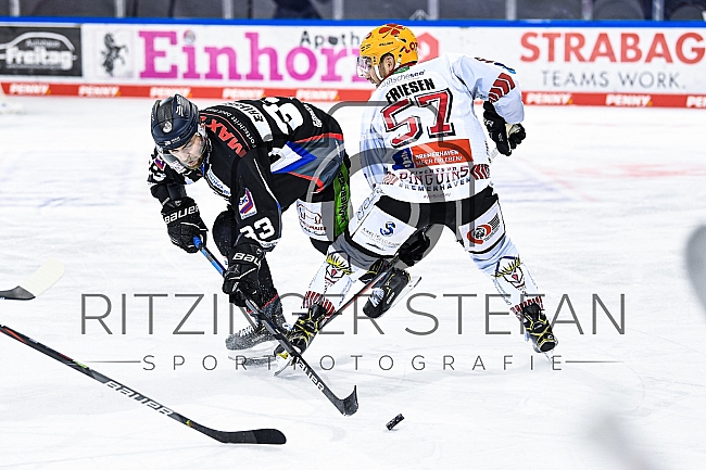 Fredrik Eriksson (Nr.33 - Straubing Tigers) nicht zu stoppen von Alex Friesen (Nr.57 - Fischtown Pinguins)