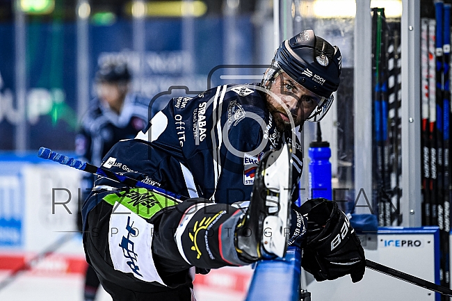 Fredrik Eriksson (Nr.33 - Straubing Tigers) mit Dehnübungen beim Warmup