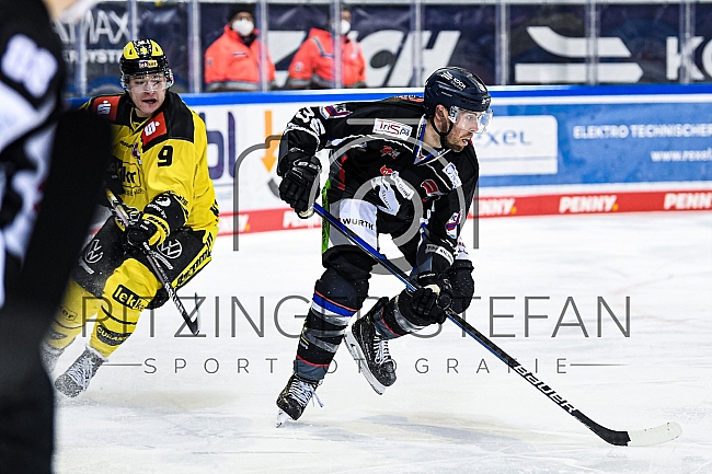 Brandon Gormley (Nr.36 - Straubing Tigers) vor Patrick Klöpper (Nr.9 - Krefeld Pinguine)