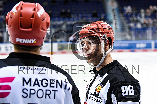 Linesmen Wayne Gerth (DEL) im Gespräch mit Linesmen Marius Woelzmueller (DEL)