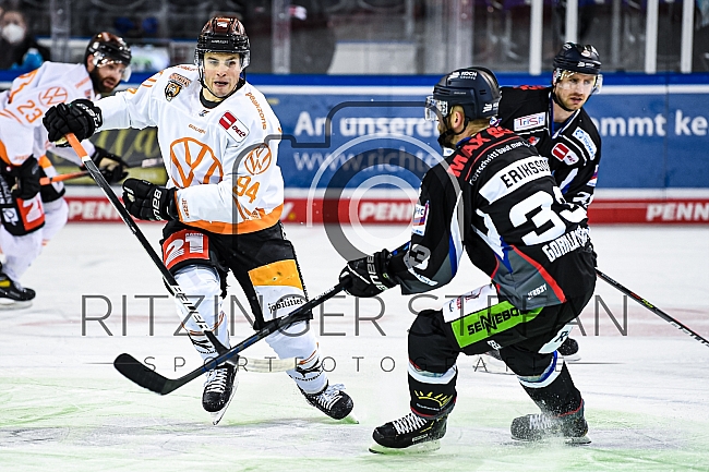 Fredrik Eriksson (Nr.33 - Straubing Tigers) im Zweikampf mit Phil Hungerecker (Nr.94 - Grizzlys Wolfsburg)