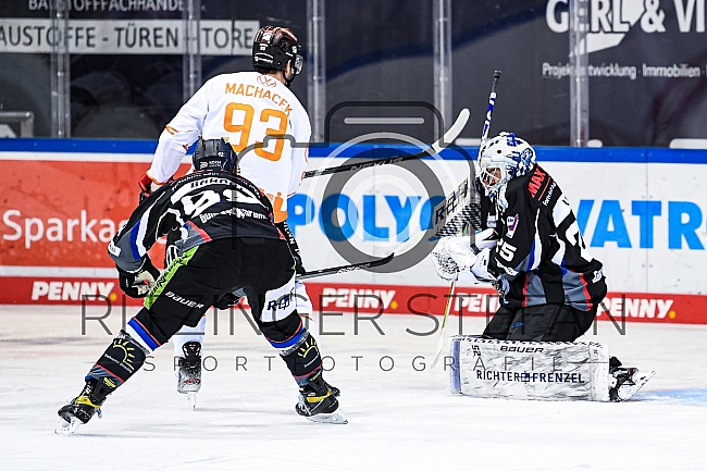 Torwart Sebastian Vogl (Nr.25 - Straubing Tigers) hält gegen Spencer Machacek (Nr.93 - Grizzlys Wolfsburg)
