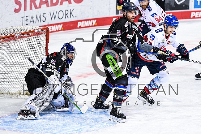 Brandon Gormley (Nr.36 - Straubing Tigers) im Zweikampf mit Stefan Loibl (Nr.13 - Adler Mannheim) vor Torwart Sebastian Vogl (Nr.25 - Straubing Tigers)