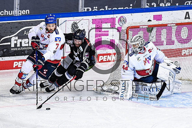 Sinan Akdag (Nr.7 - Adler Mannheim) vor Andreas Eder (Nr.20 - Straubing Tigers)
