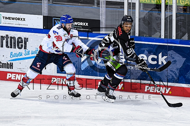 Sena Acolatse (Nr.62 - Straubing Tigers) im Zweikampf mit Jason Bast (Nr.39 - Adler Mannheim)