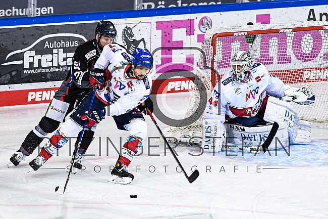 Sinan Akdag (Nr.7 - Adler Mannheim) vor Andreas Eder (Nr.20 - Straubing Tigers) am Puck