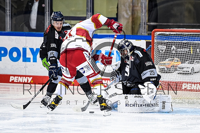 Maximilian Forster (Nr.81-EV Landshut) vor Torwart Sebastian Vogl (Nr.25 - Straubing Tigers)