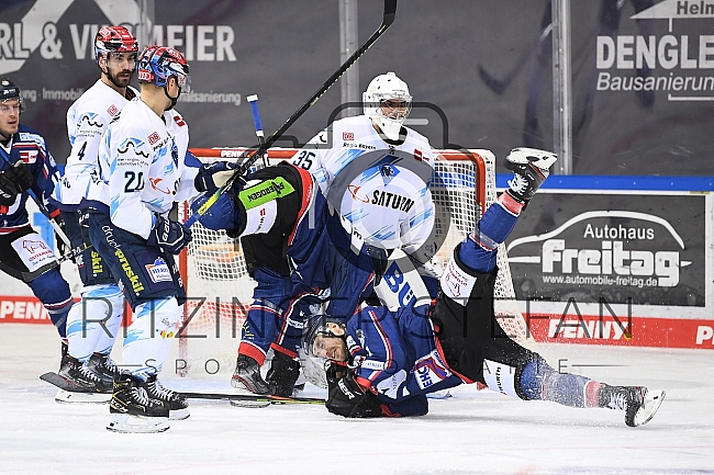 Beschreibung: Im Bild Emil Quaas (Nr.20 - ERC Ingolstadt), Kael Mouillierat (Nr.21 - Straubing Tigers), Torwart Nicolas Daws (Nr.35 - ERC Ingolstadt).