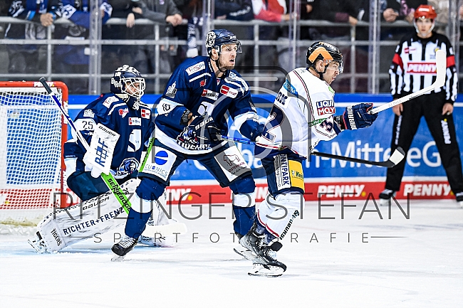 Torwart Sebastian Vogl (Nr.25 - Straubing Tigers), Benedikt Schopper (Nr.10 - Straubing Tigers), Kevin Clark (Nr.32 - Eisbaeren Berlin)
