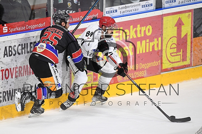 Jeffrey Smith (Nr.88-EHF Passau Black Hawks) vor Ondrej Pozivil (Nr.25 - Deggendorfer SC)