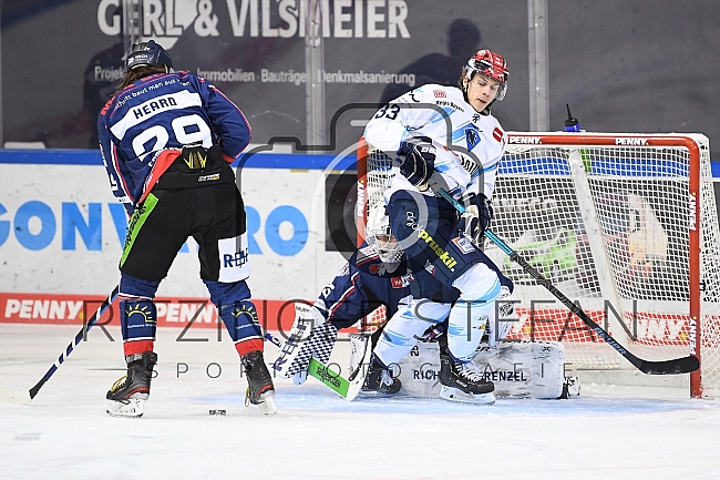 Beschreibung: Im Bild Mitchell Heard (Nr.29 - Straubing Tigers), Tim Wohlgemuth (Nr.33 - ERC Ingolstadt), Torwart Sebastian Vogl (Nr.25 - Straubing Tigers).