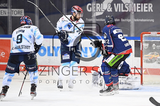 Beschreibung: Im Bild Frederik Storm (Nr.9 - ERC Ingolstadt), Brandon Defazio (Nr.24 - ERC Ingolstadt), Sena Acolatse (Nr.62 - Straubing Tigers), Torwart Sebastian Vogl (Nr.25 - Straubing Tigers).