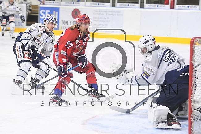 Beschreibung: Im Bild Alexander Eckl (Nr.17-SC Riessersee), Kapitaen Rene Roethke (Nr.97-Deggendorfer SC), Torwart Sebastian Pfeuffer (Nr.1-SC Riessersee).