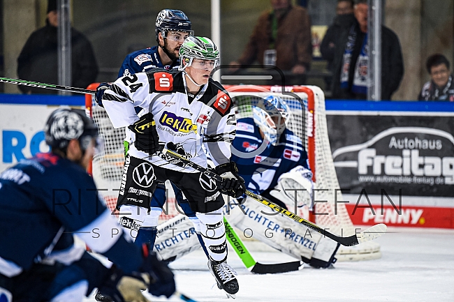 Alexander Blank (Nr.24 - Krefeld Pinguine) vor Torwart Tomi Karhunen (Nr.33 - Straubing Tigers)